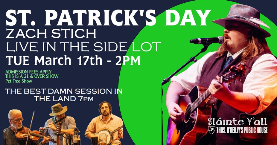 Grab your best green garb and join us for St. Patrick's Day! Zach Stich Live in the side lot 2pm followed by The Best Damn Session in the Land This is a 21 & over event, Admission fees will apply, This is a pet free event.
